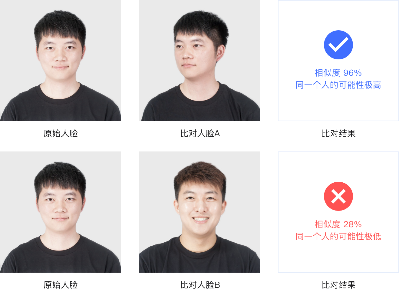 通過(guò)提取人臉特征將兩張人臉進(jìn)行比對(duì)來(lái)判斷是否是同一個(gè)人,并給出置信度評(píng)分,即 1:1 身份驗(yàn)證。人臉對(duì)比技術(shù)在一定范圍內(nèi)兼容年齡、化妝或其他容貌改變的情況,被廣泛用于基于人臉的用戶(hù)身份認(rèn)證以及人證合一驗(yàn)證。